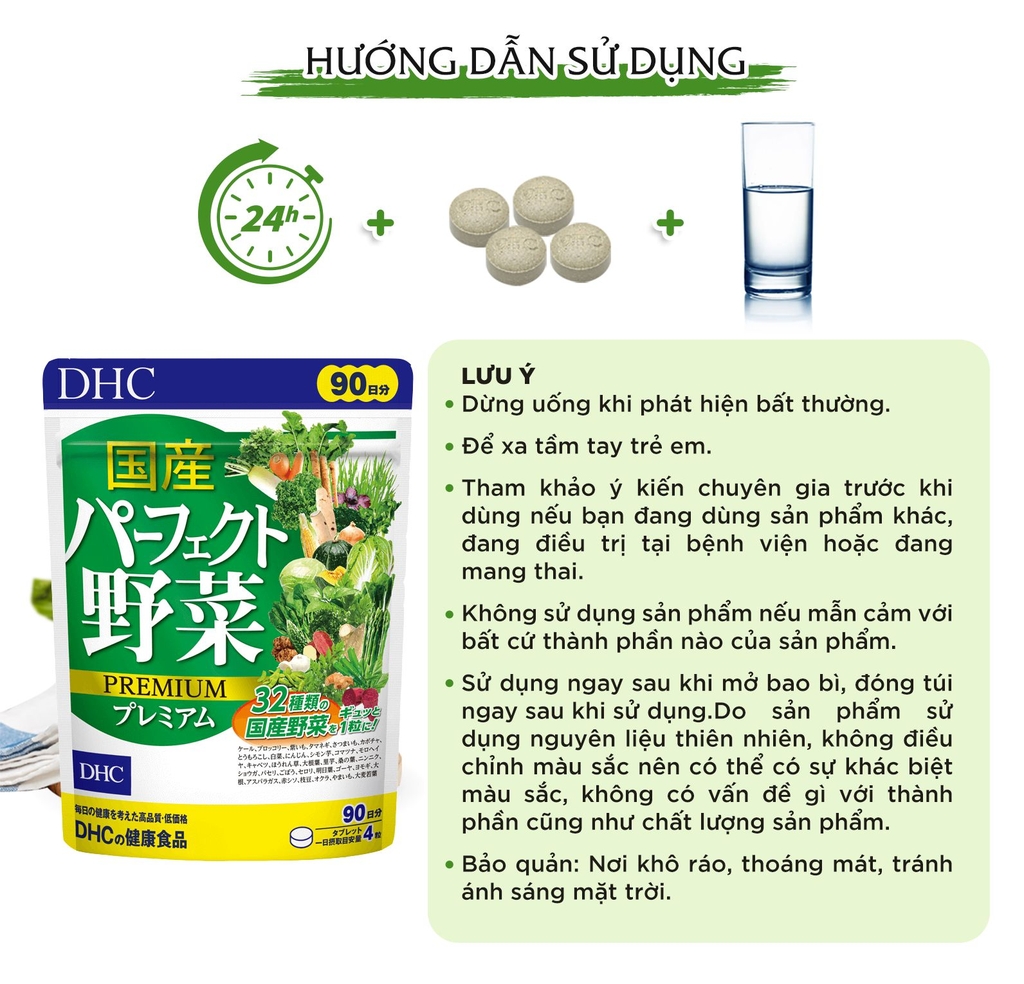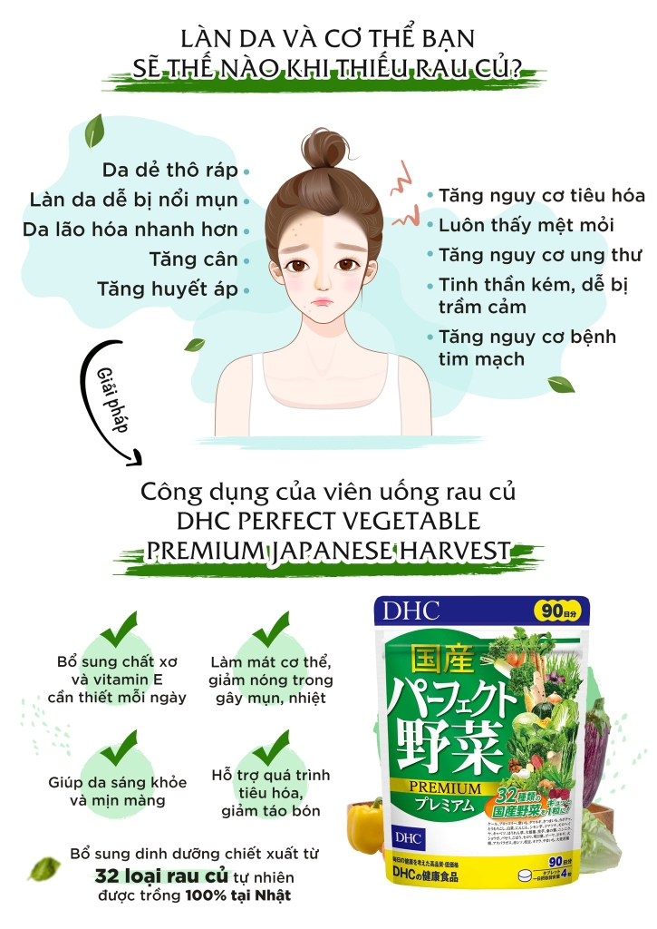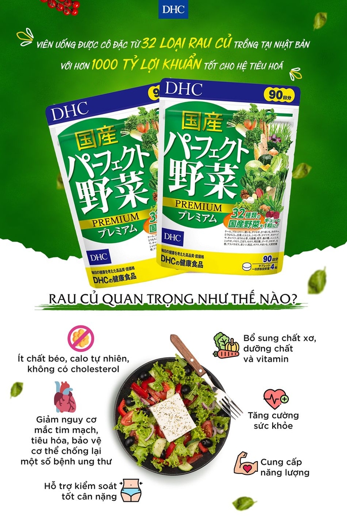 Viên uống rau củ DHC Perfect Vegetable chiết xuất từ 32 loại rau củ được trồng tại Nhật Bản giúp bạn bổ sung các chất dinh dưỡng thiết yếu cho cơ thể mỗi ngày. Viên uống có chứa đến 1000 tỉ nấm men và lợi khuẩn acid lactic hỗ trợ hệ tiêu hóa khỏe mạnh hơn, giúp da sáng khỏe, mịn màng.