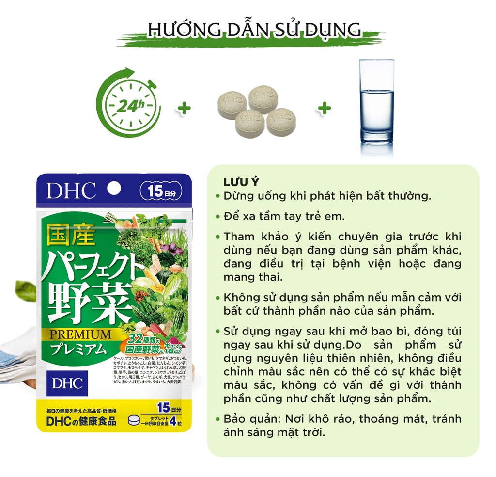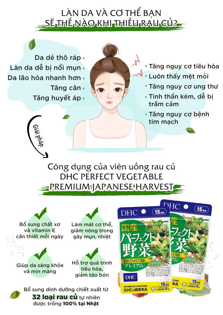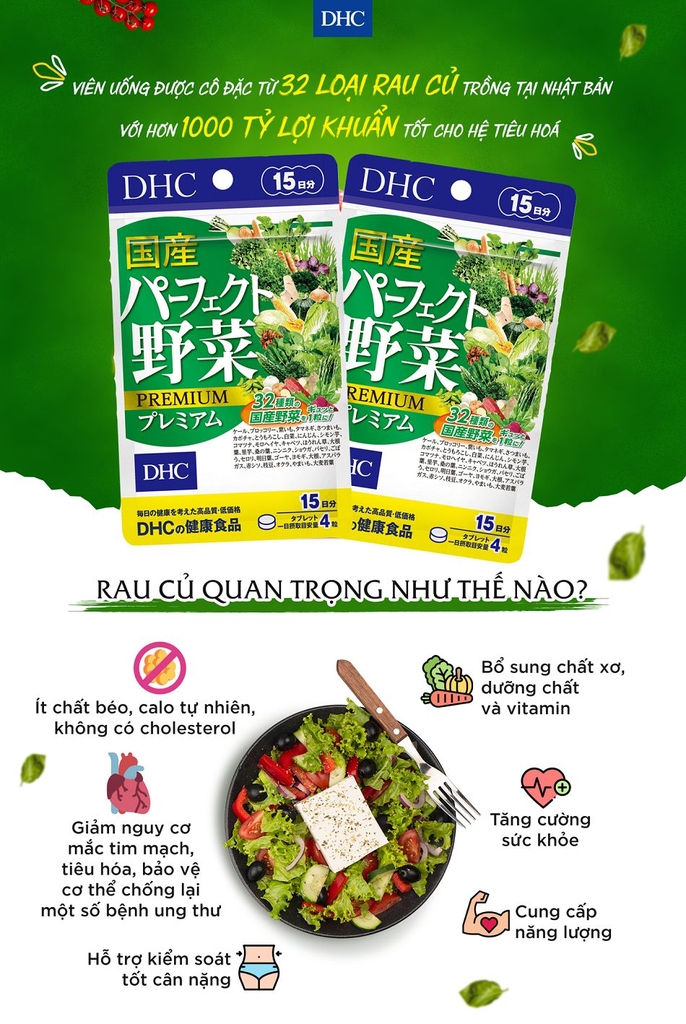 Viên uống rau củ DHC Perfect Vegetable chiết xuất từ 32 loại rau củ được trồng tại Nhật Bản giúp bạn bổ sung các chất dinh dưỡng thiết yếu cho cơ thể mỗi ngày. Viên uống có chứa đến 1000 tỉ nấm men và lợi khuẩn acid lactic hỗ trợ hệ tiêu hóa khỏe mạnh hơn, giúp da sáng khỏe, mịn màng.