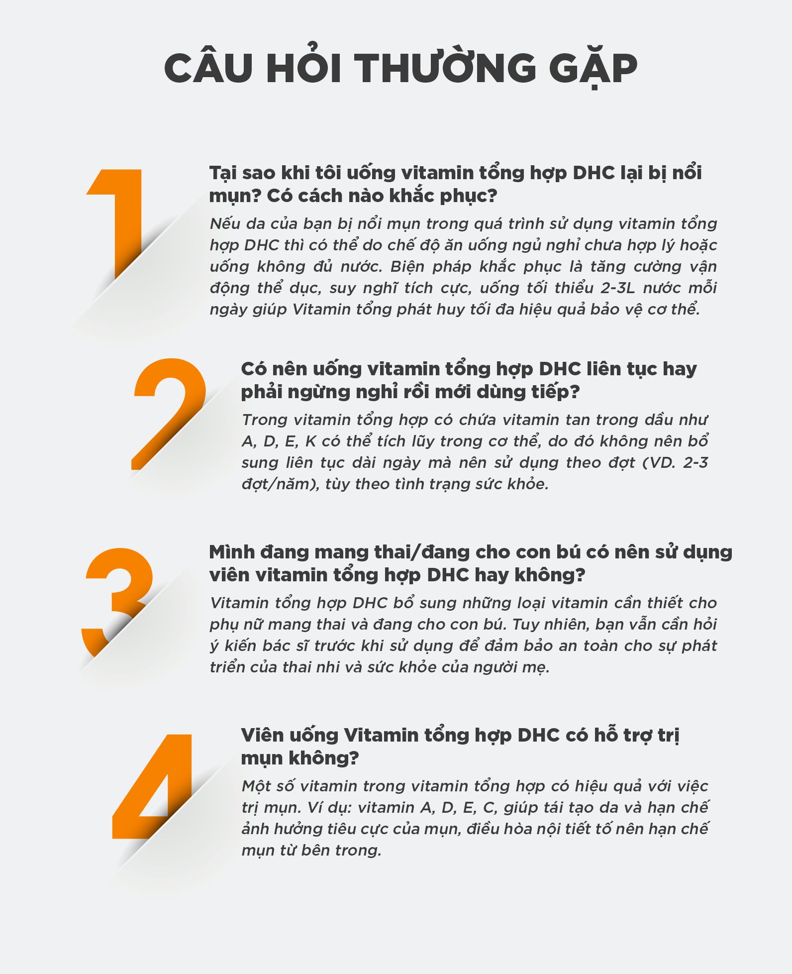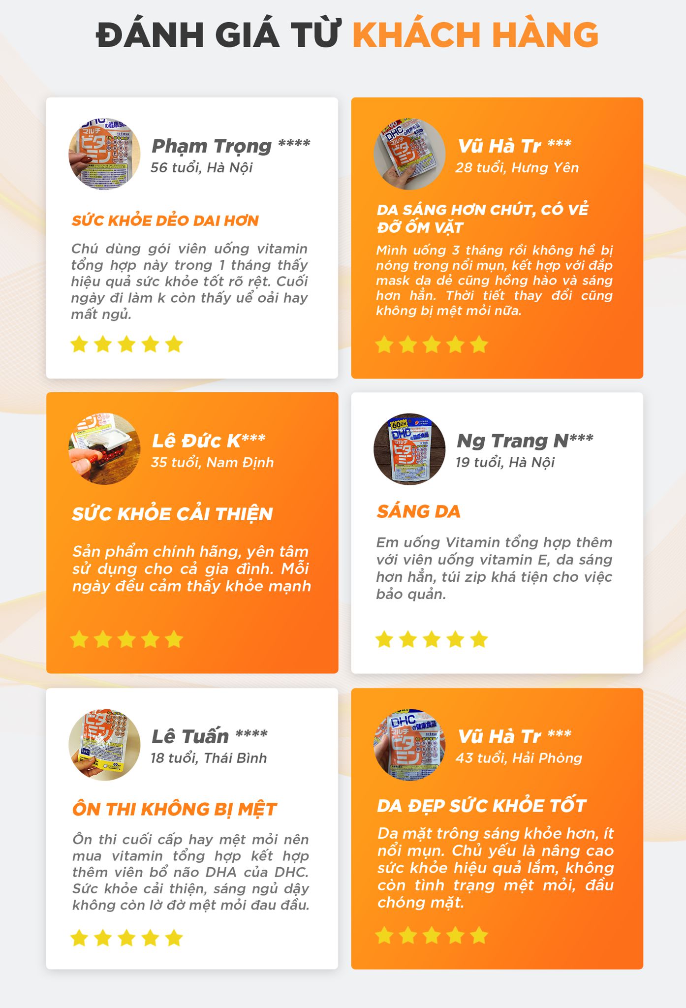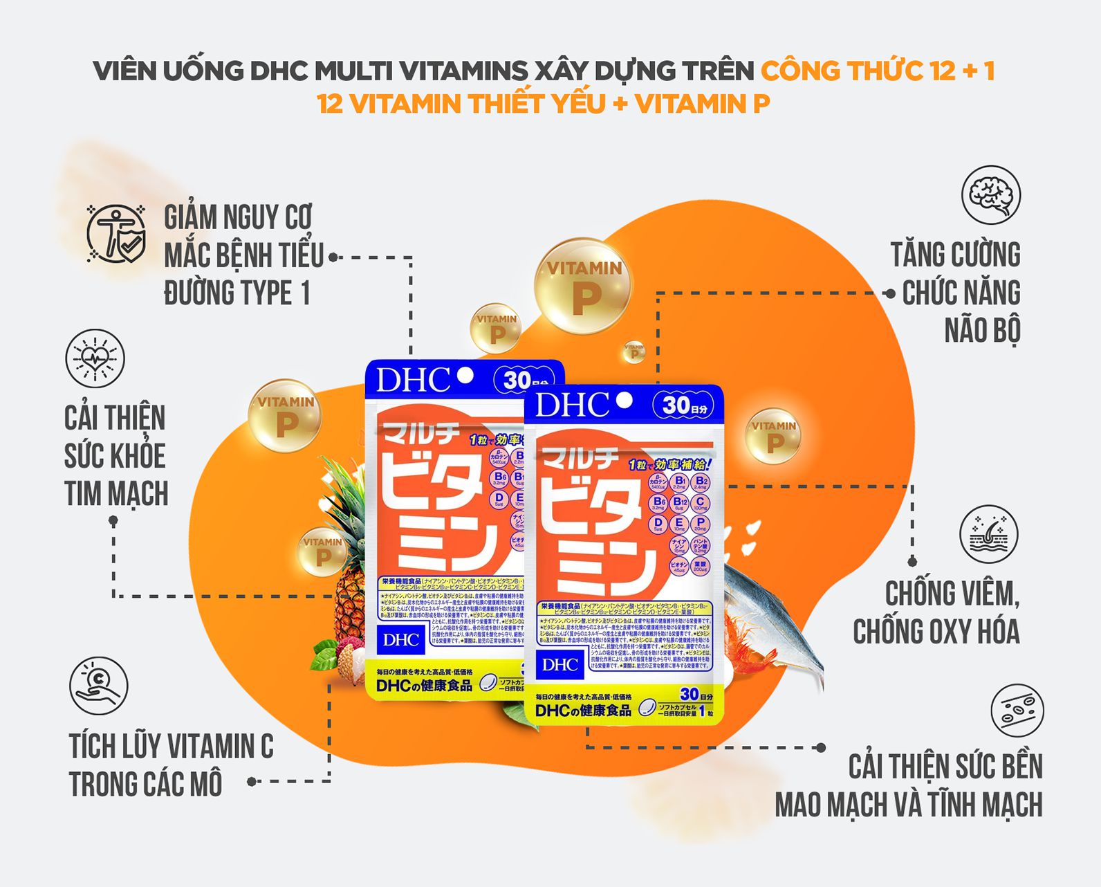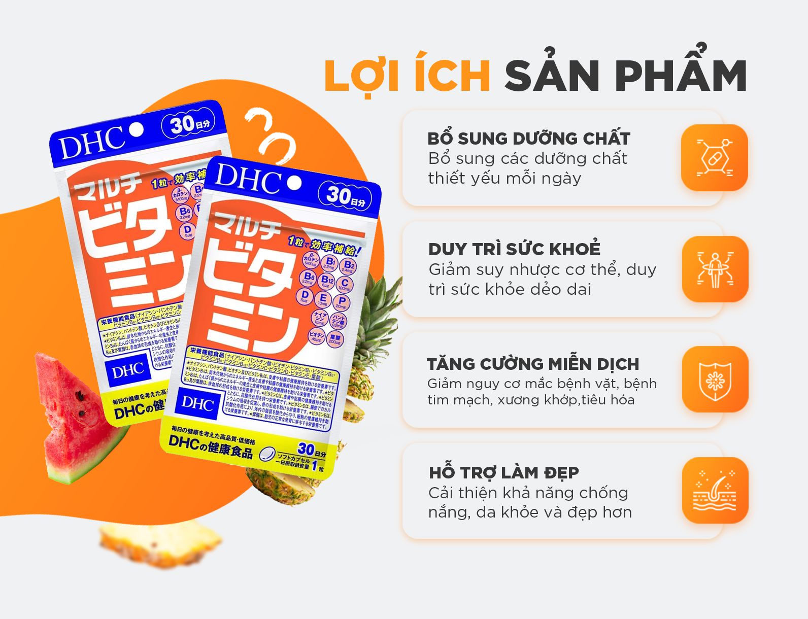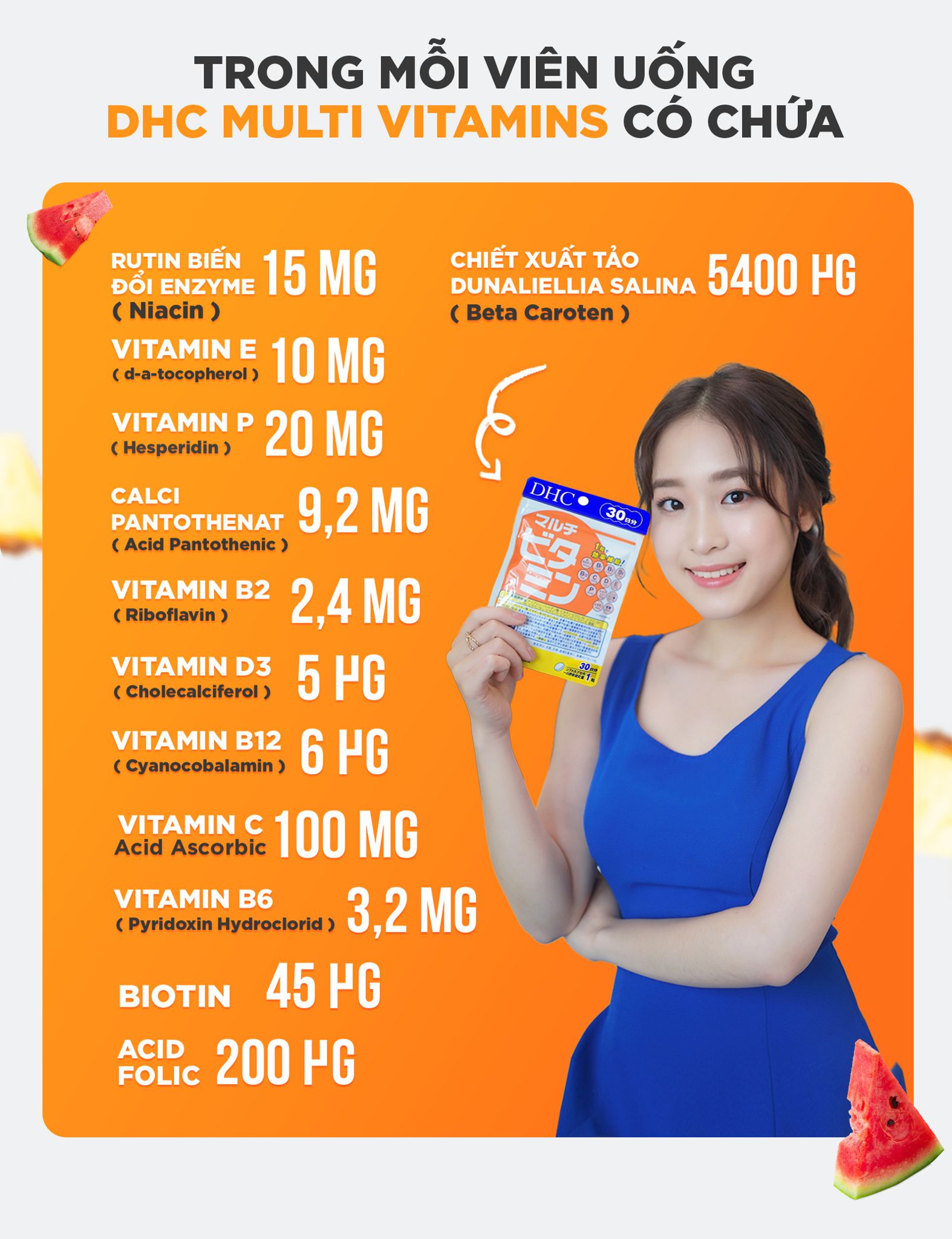 Viên uống DHC Vitamin tổng hợp bổ sung các dưỡng chất thiết yếu với hàm lượng phù hợp cho cơ thể bạn luôn khỏe mạnh, tăng cường hệ miễn dịch và giảm nguy cơ mắc các loại bệnh vặt. Không chỉ có thế, viên uống còn hỗ trợ phần nào trong quá trình chăm sóc da và làm đẹp của chị em phụ nữ.